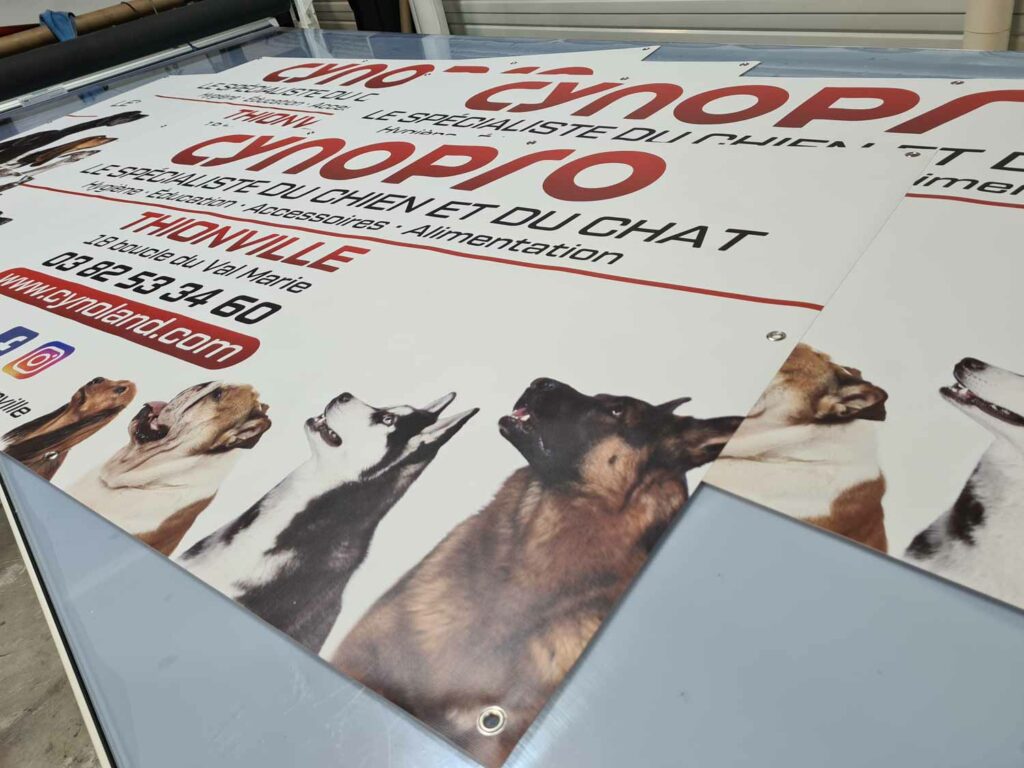 Totalement personnalisable, elle peut être réalisée dans n’importe quel format, avec œillets, fourreaux, tendeurs ou renforts selon le type de fixation souhaité. La qualité d’impression garantit des couleurs vives et un rendu professionnel, parfaitement adapté pour attirer l’œil et mettre en avant votre message.
