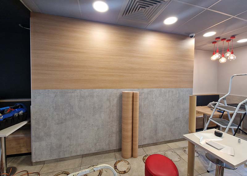• Habillage mural en film DINOC : modernisation des surfaces avec des revêtements techniques haut de gamme.