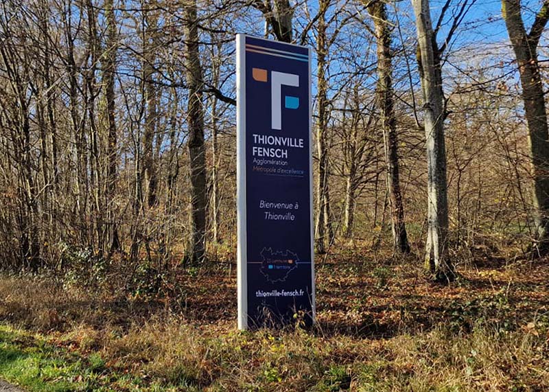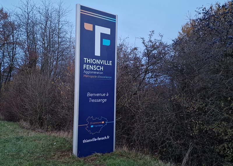 Positionnés aux principales entrées d’agglomération, de Lommerange, Tressange et Rochonvillers, en passant par Thionville, jusqu’à Basse-Ham, Kuntzig et Illange, ces totems marquent désormais l’entrée du territoire Thionville Fensch. - Les rénovations ont consisté en la pose de nouvelles plaques en aluminium Dibond, associées à un adhésif en impression numérique, garantissant durabilité, visibilité et cohérence graphique.