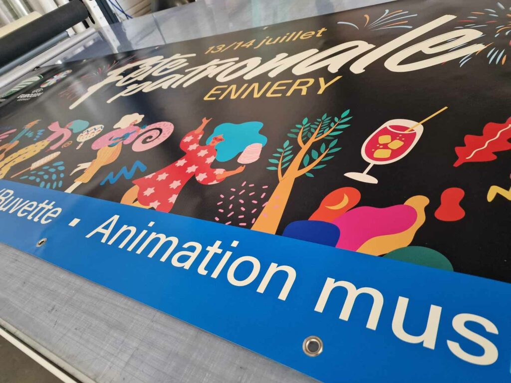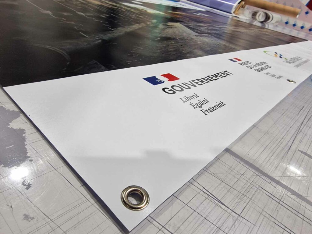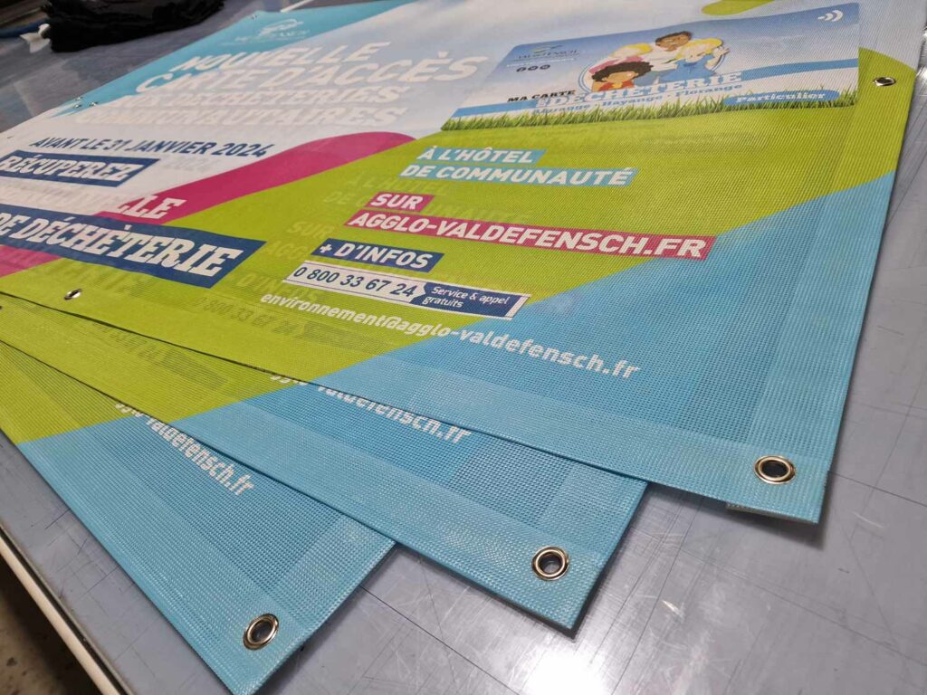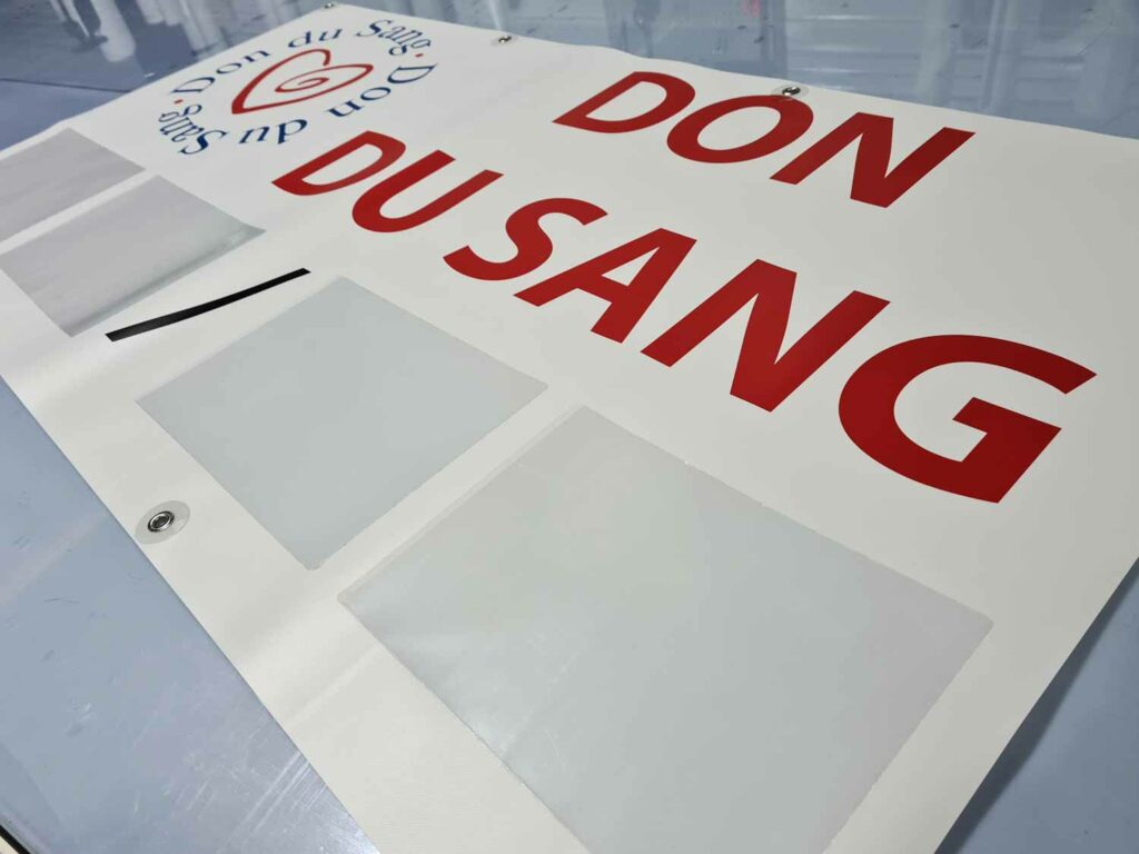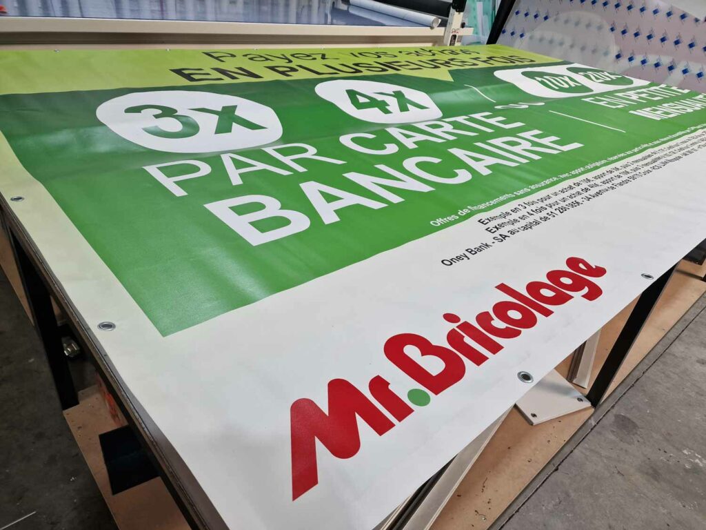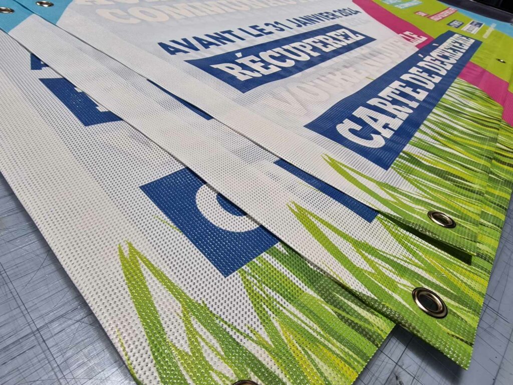 Totalement personnalisable, elle peut être réalisée dans n’importe quel format, avec œillets, fourreaux, tendeurs ou renforts selon le type de fixation souhaité. La qualité d’impression garantit des couleurs vives et un rendu professionnel, parfaitement adapté pour attirer l’œil et mettre en avant votre message.