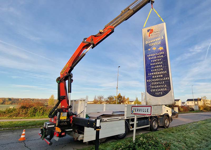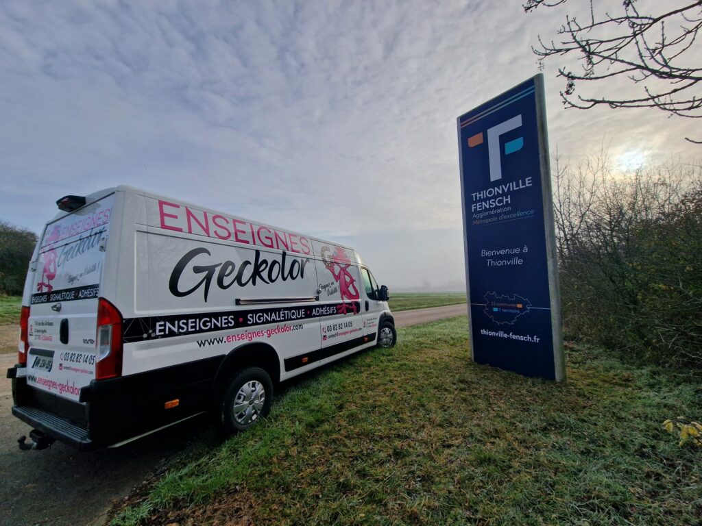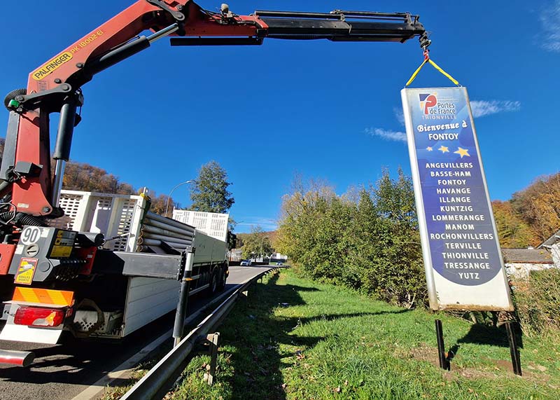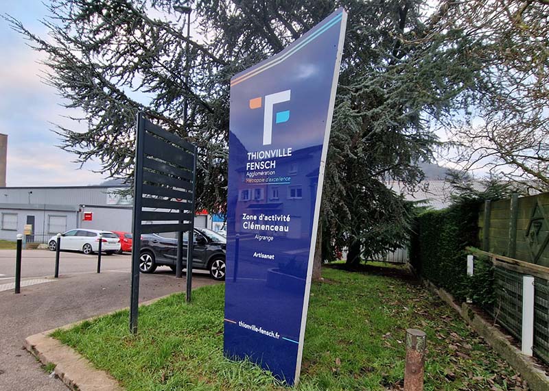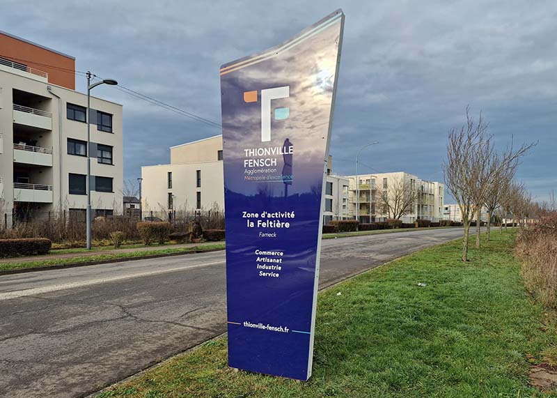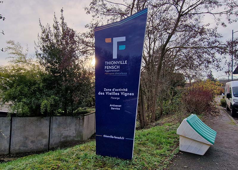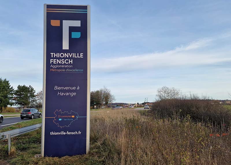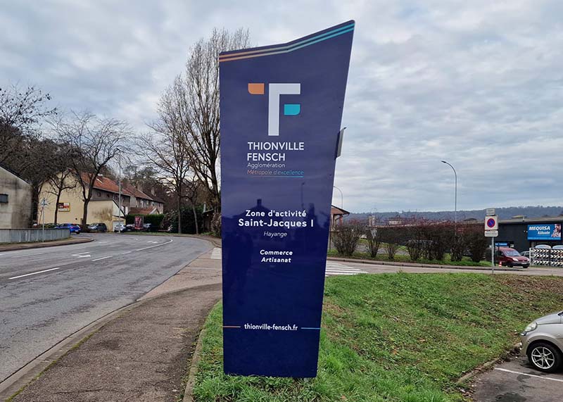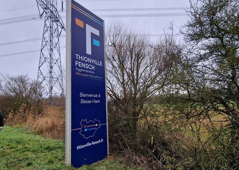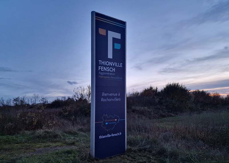 Positionnés aux principales entrées d’agglomération, de Lommerange, Tressange et Rochonvillers, en passant par Thionville, jusqu’à Basse-Ham, Kuntzig et Illange, ces totems marquent désormais l’entrée du territoire Thionville Fensch. - Les rénovations ont consisté en la pose de nouvelles plaques en aluminium Dibond, associées à un adhésif en impression numérique, garantissant durabilité, visibilité et cohérence graphique.